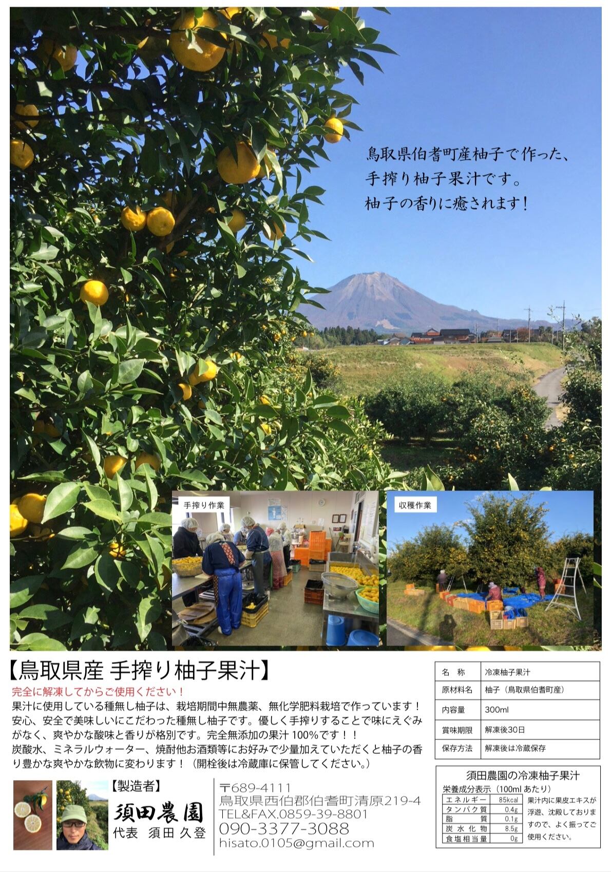 須田農園の柚子の特徴は、種無し柚子で鳥取県大山の麓、クロボク土で育った柚子はとても香りが強く、味はまろやかです。